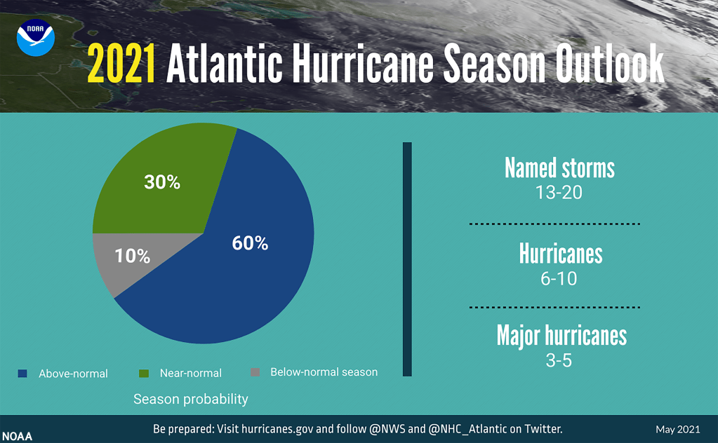 For 2021, a likely range of 13 to 20 named storms (winds of 39 mph or higher), of which 6 to 10 could become hurricanes (winds of 74 mph or higher), including 3 to 5 major hurricanes (category 3, 4 or 5; with winds of 111 mph or higher) is expected. NOAA provides these ranges with a 70% confidence.